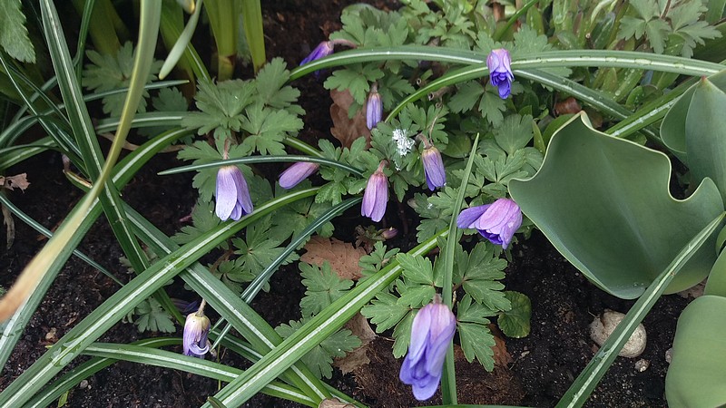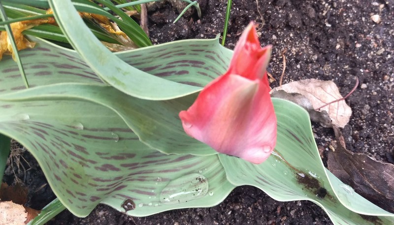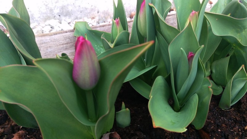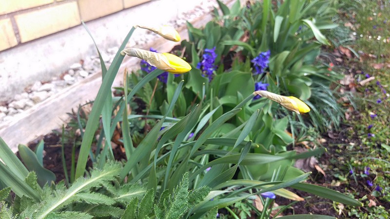 Det är regn och rusk i dag, men det gör inte så mycket. Jag har jobb att göra inomhus och jag behöver inte ut. Fast jag var ute en liten vända och kolla rabatten och nu när det har kommit lite regn börjar tulpanerna minsann visa sig och lite annat smått och gott också.
