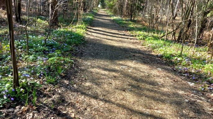Underbar vårstig, vi har här också med vitsippor. Vi är också nära hemmet, passar denna sommar. Man får passa på när solen visar sig.